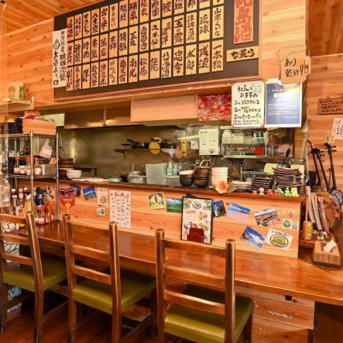 夕方には店先の赤ちょうちんに灯がともります。まさに沖縄の大衆居酒屋の雰囲気抜群!!扉を開けて一歩、入るとそこはもう別世界。オリオン提灯や暖簾、そしてズラッと並ぶ宮古の泡盛が沖縄の雰囲気を醸し出しています♪